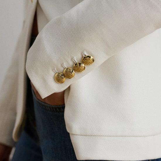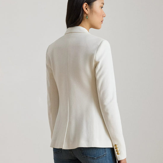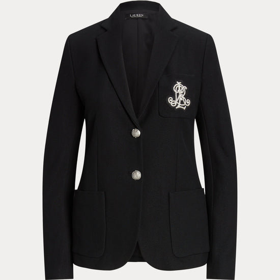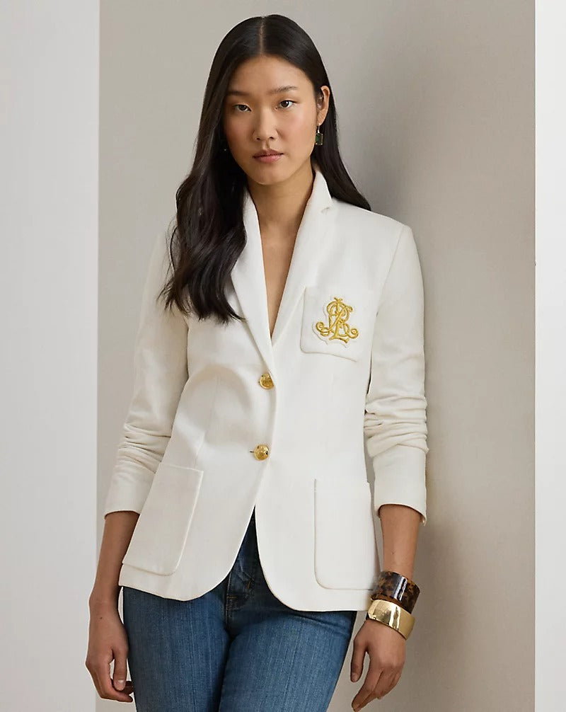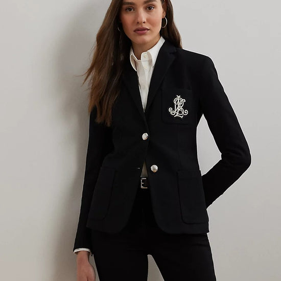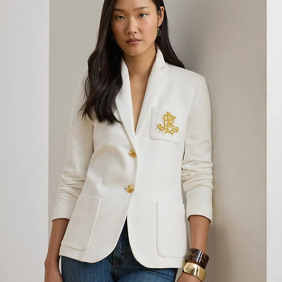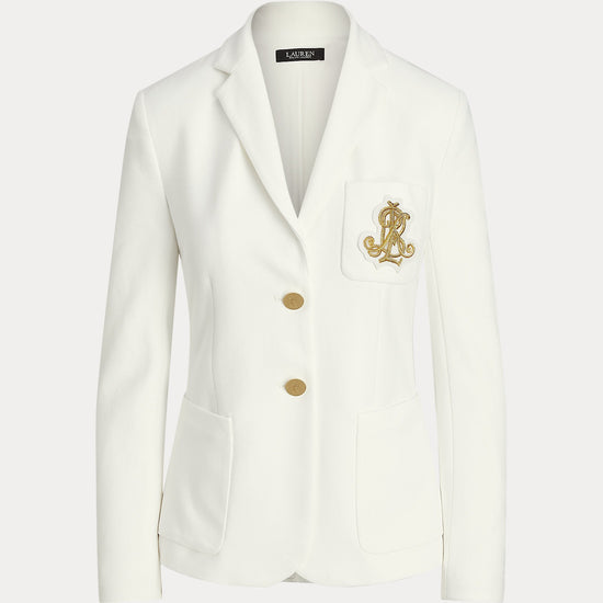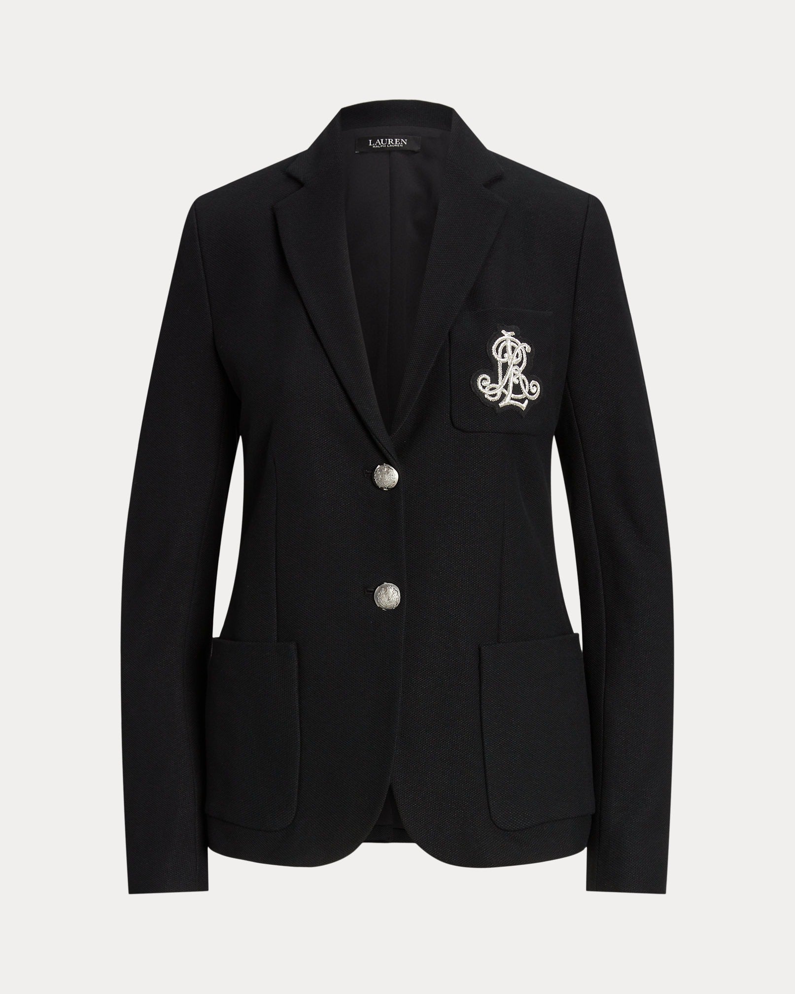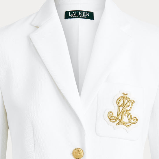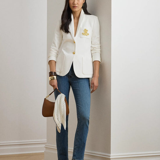This chic jacquard blazer embodies Lauren style with a signature bullion patch on the chest and luxurious crest-embossed buttons.